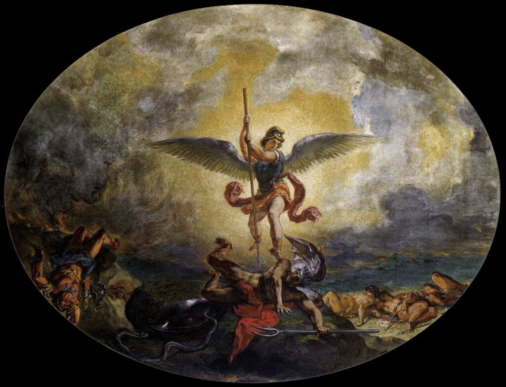 After you are finished in the Chapel of the Virgin, head towards the exit of the church by walking along the south aisle (the opposite side of the Gnomon in the transept). The last chapel on the left will be the Chapel of the Holy Angels. This chapel features 3 massive murals by Eugène Delacroix depicting Angels in action.