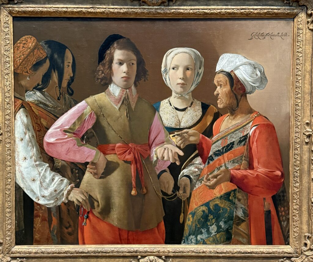 The Fortune Teller (c.1630) Georges De La Tour. The well dressed young man is hoping to gain something from having his fortune read. Instead, he is going to lose some of his valuable possessions. La Tour is cautioning us to not trust false wisdom, for it can lead to downfall.