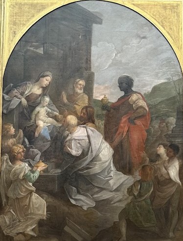Adoration of the Magi (1642) Guido Reni. The museum places this large altarpiece on the opposite wall from Caravaggio’s Crucifixion of St. Andrew. The Reni wall represents his version of idealism, where he draws from nature but enhances it to attempt to achieve an even more perfect representation of the subject. However, this was one of Reni’s last paintings and at this time in his career Reni had begun painting his subjects in a less concrete and naturalistic manner and instead creating a less defined. almost drawing like quality. This painting was found in Reni’s workshop after his death and it is obvious that it is unfinished, you can see baby Jesus’ leg has been repositioned with the original leg covered in blue and there is also a dog’s head by the angel.
