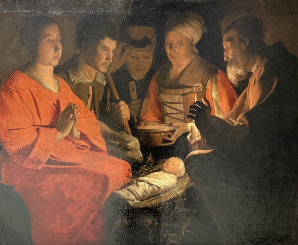 Adoration of the Shepards (1644) by Georges de La Tour. La Tour takes a cue from the Northern Baroque artists and includes a candle as the light source for the painting, creating an effect that the light is radiating from Baby Jesus. Typical of Caravaggio, the Holy Family and shepherds are wearing contemporary clothing of the painter’s time.