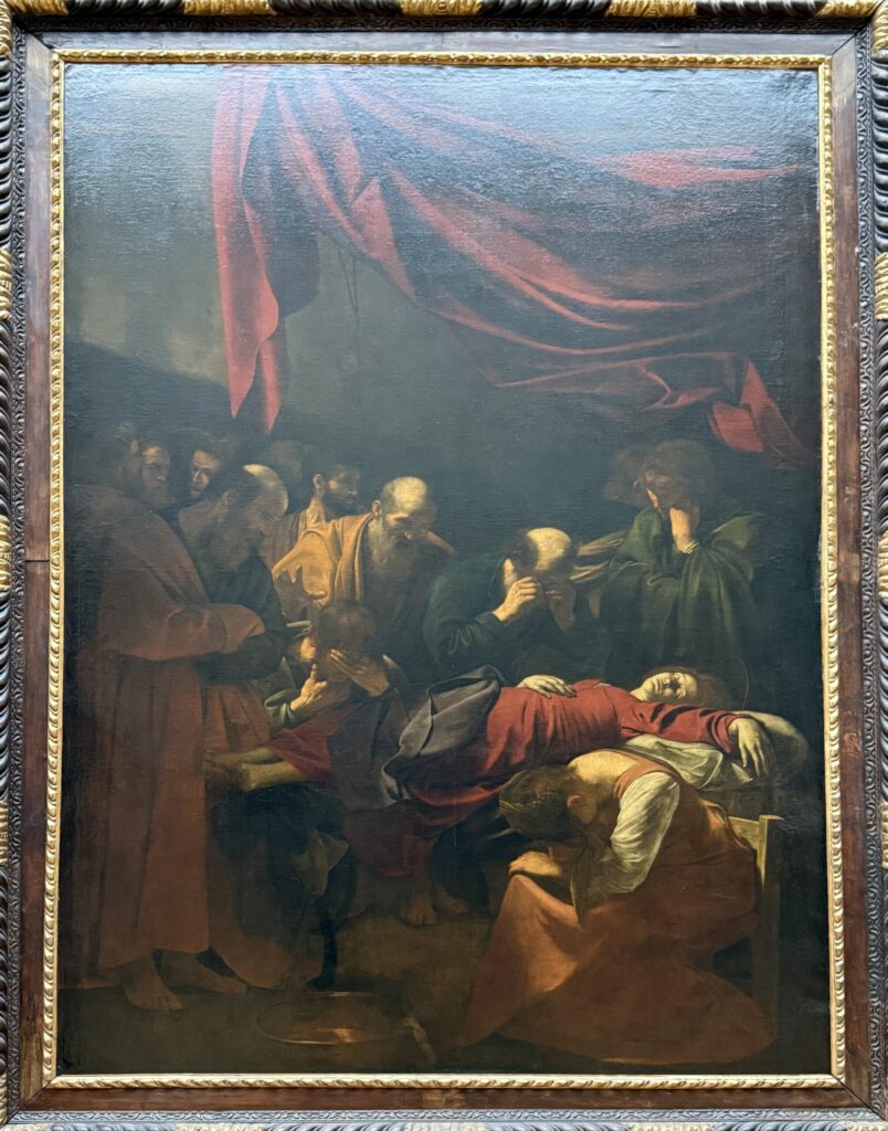 The Venetian painter Carlo Saraceni also depicted the Virgin dead; though she appeared less lifeless than in Caravaggio’s version. He modified the painting to depict her alive but it was still rejected. It was not until Saraceni included cherubs and a more heavenly presence above the Virgin that his painting was accepted and still hangs at Santa Maria della Scala in Rome(2). The first version is on display at the Met in New York(3), and another version is exhibited in Venice at the Gallerie dell’Accademia(4).