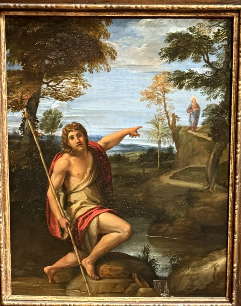 Saint John the Baptist Bearing Witness (c.1600) Annibale Caracci. Here we see John the Baptist wearing his usual animal skin clothing and carrying a staff with the cross on top. The saint has turned toward us to direct our attention to a figure in the distance. At first glance, based on the clothing, pose and the light obscuring the face you might mistakenly think that we are looking at Mary; however, upon closer inspection see that we are witnessing Jesus making his way down the path to be baptized by John.