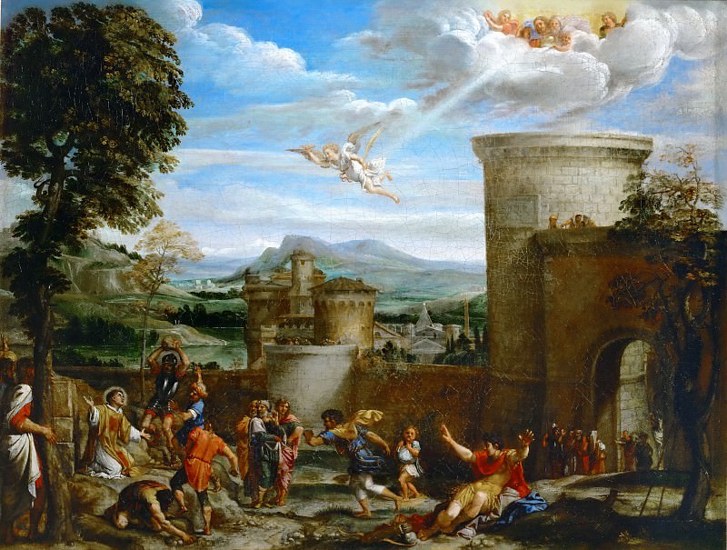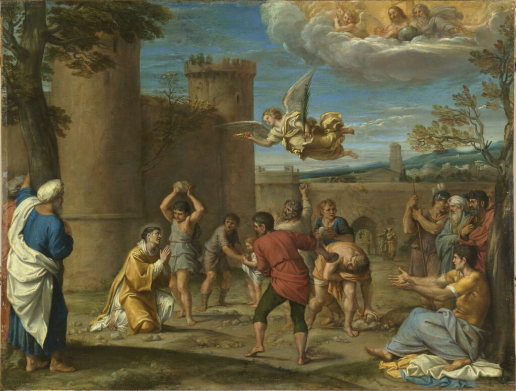 The Stoning of St. Stephen (c.1603) Annibale Caracci. December 26th is the Feast Day of St. Stephen. St. Stephen is recognized as the protomartyr (first martyr) of Christianity. He was stoned to death outside of the walls of Jerusalem after provoking a crowd. Caracci’s depiction shows what Stephen cried out , “Behold, I see the heavens opened, and the Son of Man standing on the right hand of God.”(Acts 7-56) We see St. Stephen focused on the sky as an angel flies toward him with a martyr’s crown and palm frond as God watches (globe in hand) with Jesus on his right. We also see Saul (later to be Paul), sitting against a tree with garments on the ground nearby that the stone-throwers had laid at his feet.