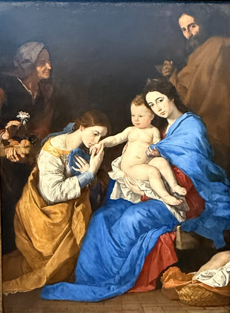 The Holy Family with Saints Anne and Catherine of Alexandria (1648) Jusepe de Ribera. Ribera combines the influence of Caravaggio and Reni in this beautiful depiction of the Holy Family with visitors. The background shows painting from models in the style of Caravaggio and the foreground shows idealized faces with a bright color palette in the style of Reni.