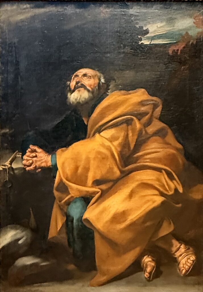 The Tears of Saint Peter (c1613) Ribera. Here is another treatment of the popular Counter-Reformation doctrine that penitence is a true sacrament and not simply a spiritual attitude as the Protestants argued. Emotion such as weeping is interpreted as repentance and this type of painting encouraged the viewer to reflect deeply on their own sins. We see Peter with clasped hands, his eyes up to the heavens, the weight of his guilt is obvious on his face.